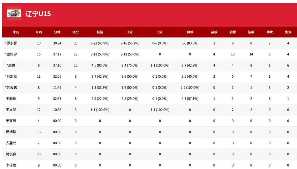在长春赛区的U15男篮赛事中,辽宁队展现出显著优势,整体投篮命中率达到44.1%,远超对手的34.8%。辽宁队三名球员得分上双,其中邵永哲取得23分、8篮板和2助攻,史铭宇贡献12分、14篮板和3助攻,周也以高效表现得到12分和8篮板。北京队同样有三名球员得分上双,刘艾伦、杨灏洋和张梦诚分别获得13分、16分和15分,董一阳则有8分和10篮板入账。决赛定于10月14日举行,考虑到河北队的实力相对较弱,辽宁U15队有望夺得赛区冠军。